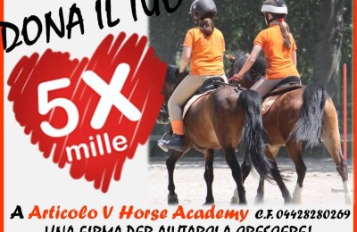In questo periodo, con la dichiarazione dei redditi modello 730, è possibile devolvere il 5×1000 anche alle associazioni sportive. Se ti fa piacere, aiutaci devolvendo il tuo 5X1000 all’Articolo V Horse Academy, ci aiuterai a crescere! Diffondi la notizia tra i tuoi amici e/o parenti.